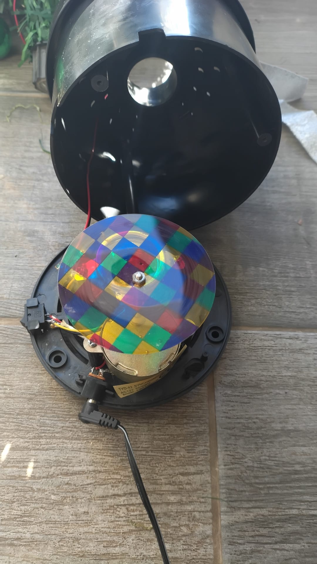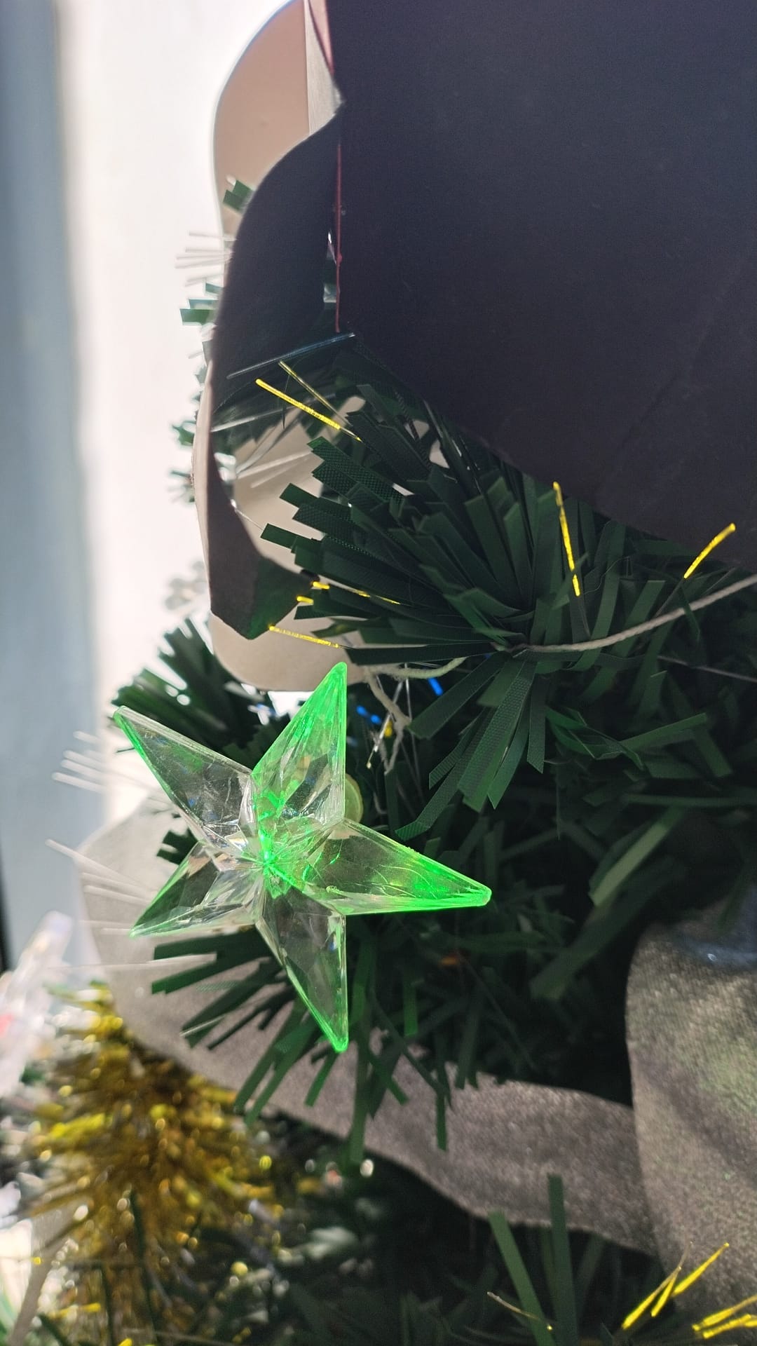 Tengo un viejo y sencillo árbol de Navidad de plástico que tiene unas estrellas con luces multicolor y, además, tiene fibra óptica insertada que, usando una pequeña luz halógena de 12V en la base y un motor con una rueda de colores hace que tenga destellos de color cambiante en todo el árbol.