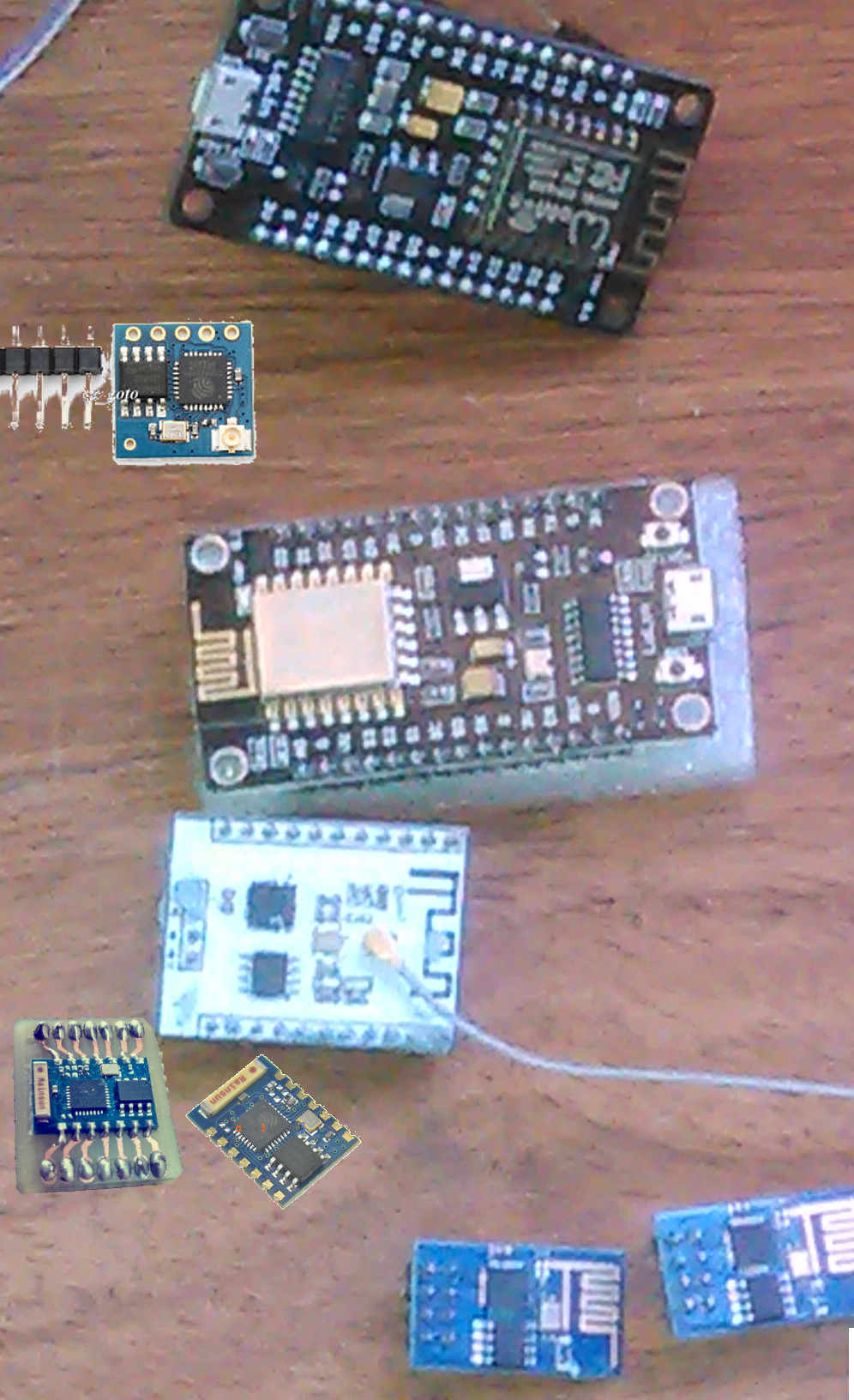 ESP05: sirve como puente WiFi para otro microcontrolador, usado con comandos AT. No es reprogramable. Poco recomendado, pero útil para su función. Es diminuto.