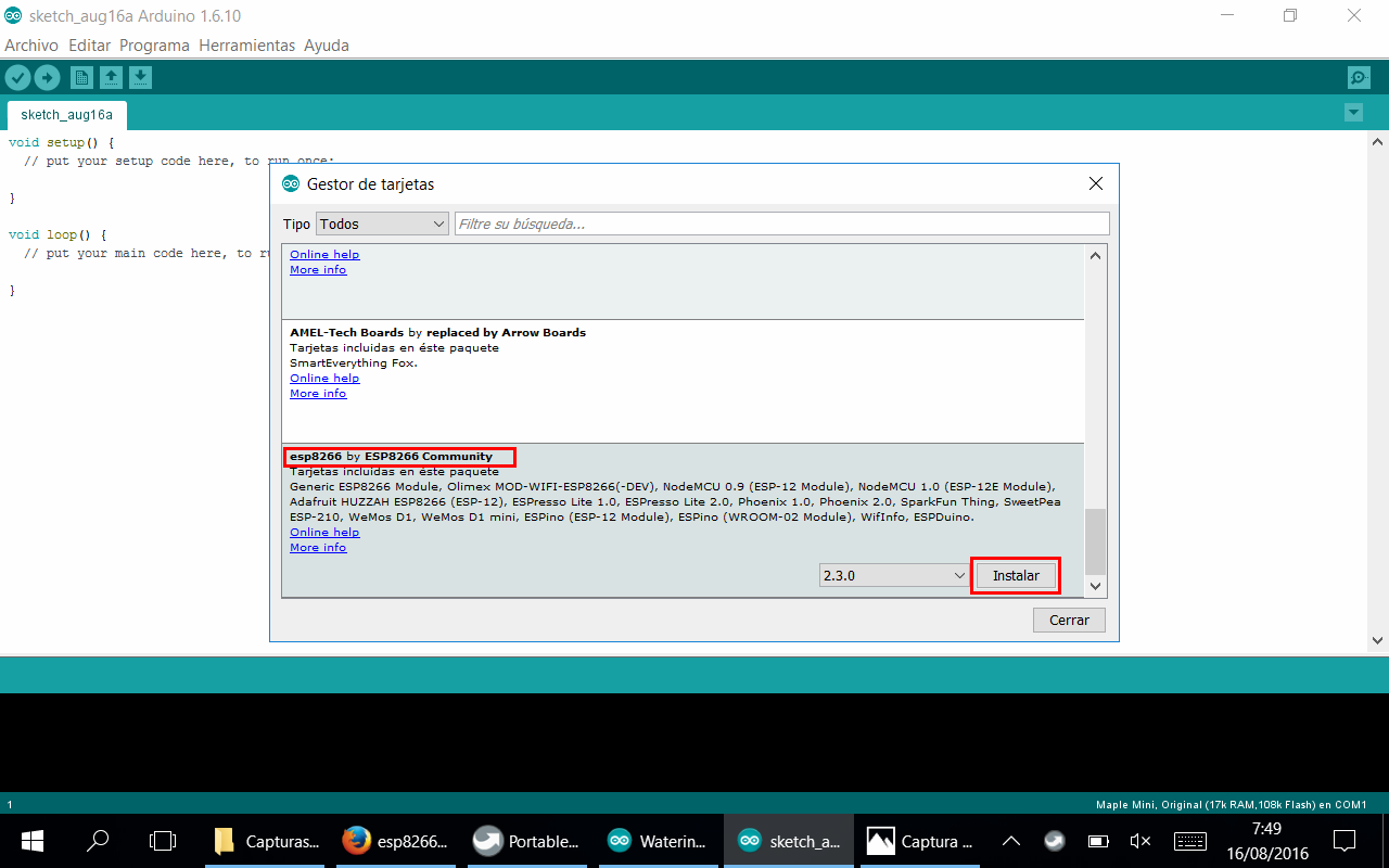 5) Una vez que se haya actualizado la información (se hace automáticamente) buscamos la opción "esp8266 by ESP8266 Community" y pulsamos el botón "Instalar".