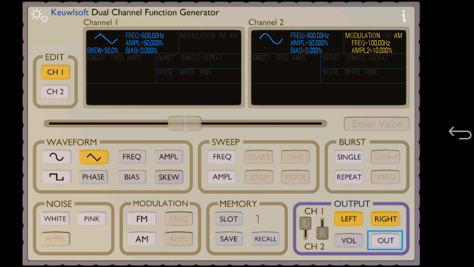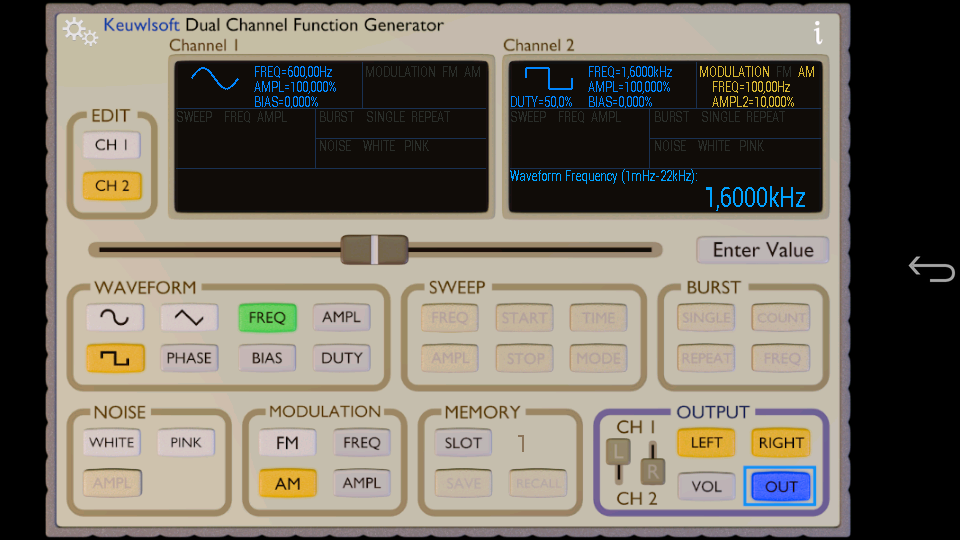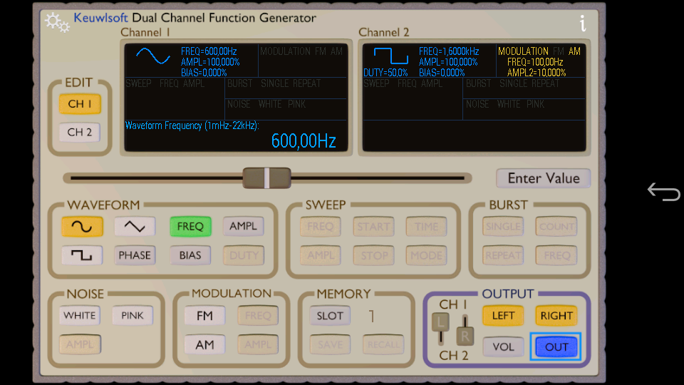Tras mirar diversas aplicaciones similares la que mas me ha gustado para usar el teléfono como generador de señales es ésta. Tiene dos canales y la apariencia de la App es similar a un generador de señales físico, aunque cambia levemente para permitirnos manejar mejor los detalles de cada función.