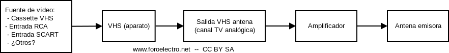 Si sustituimos el VHS por un modulador digital COFDM, ya tendríamos una mini emisora TDT casera... yo lo utilizaba para mandar con un DVD conectado películas X desde mi cuarto hacia el cuarto de baño (ya sabeis para que xD) El "engendro· consistía en un VHS ajustado al canal 29 UHF cuya salida iba a un amplificador de mástil Hirsmann (llevaba dos transistores BFR91 en cascada) y la salida a la fuente de 24 V y a un trozo de hilo. En el cuarto de baño se veía con niebla... pero se veía, en una TV portátil b/n.